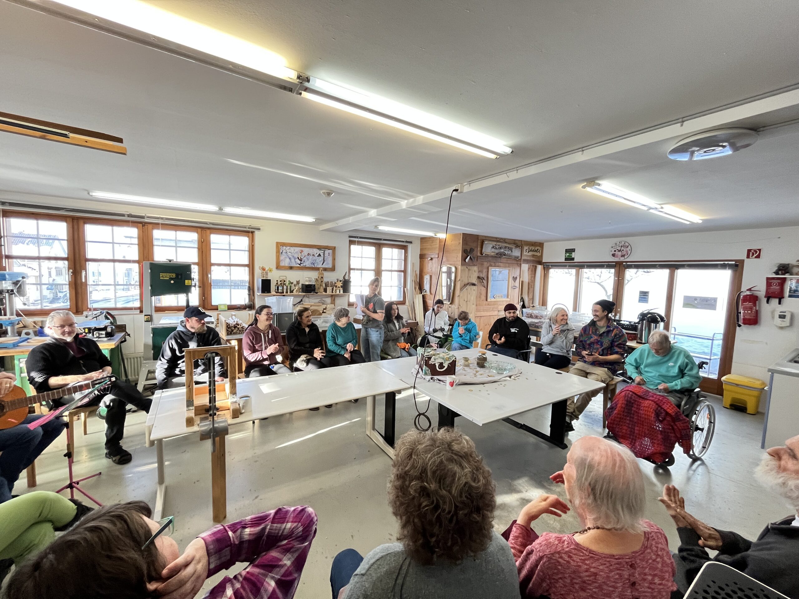 Tag für Tag helfen unsere Bewohnenden, die nicht in externen Werkstätten angestellt sind, bei uns in den unterschiedlichsten Bereichen mit: Werkstatt, Atelier, Hauswirtschaft, Wäscherei, Küche und auch in der Umgebungspflege. Als Wertschätzung dafür wurde nun im November die „Schatzkiste“ ins Leben gerufen, wo sich jeden Monat alle Bewohnenden und Mitarbeitenden gemeinsam in der Werkstatt treffen, um miteinander zu singen, Spass zu haben, Wertschätzung zu geniessen und zum Schluss natürlich ein Geschenk aus der Schatzkiste auswählen. Dies sind Farbstifte, Gutscheine fürs Brocki, hochwertige Duschmittel und Handcrèmes sowie Bastelutensilien und Modeschmuck. Spannend, wer sich jeweils für welches Geschenk entscheidet, und manchmal auch sehr überraschend! Und herzerwärmend, wenn über 20 Personen zusammen Lieder wie „das alte Haus von Rocky Docky“ zusammen singen. Einfach Wunderbar!